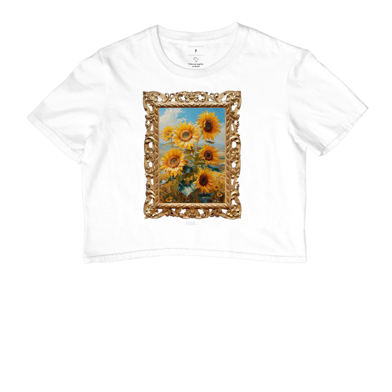 “A t-shirt ‘Campo de Sol e Ouro’ é uma ode à beleza natural e ao luxo sutil. Apresenta um deslumbrante buquê de girassóis ainda plantado, com um céu azul vibrante e uma paisagem rica ao fundo. A moldura dourada adiciona um toque sofisticado e elegante, realçando a exuberância floral e o brilho do design. Vista ‘Campo de Sol e Ouro’ e deixe que a combinação de frescor natural e requinte dourado ilumine o seu estilo.”