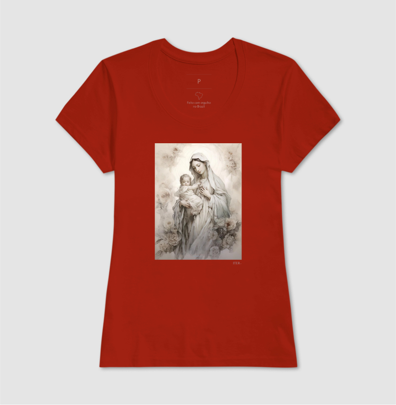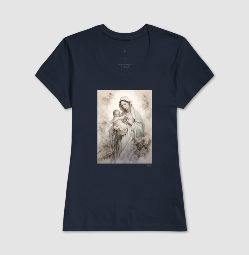 Inspirada no mistério da Encarnação, a estampa “Mãe de Deus” celebra o título mariano que afirma: Maria é verdadeiramente aquela que deu à luz o Verbo encarnado. Com traços elegantes e identidade premium, a peça retrata Maria em contemplação, com delicadeza e reverência. Uma arte que veste fé, história e tradição. Portadora da nossa humanidade: portadora de Deus.